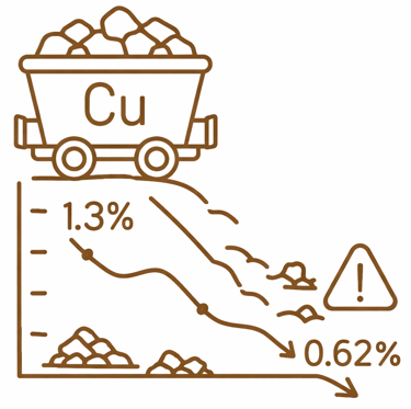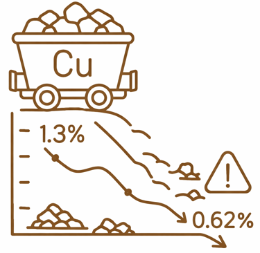 Global average copper grades have fallen from 1.3% to 0.62%, a permanent geological shift.